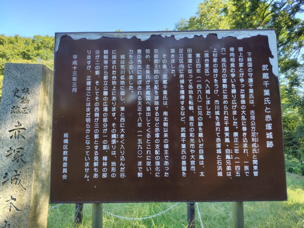 赤塚城は1456年に市川城(国府台城)から千葉自胤(ちばよりたね)この地に移った際に築いた城だと云われています。千葉氏は下総国にいたが古河公方足利成氏と手を結んだ原胤房と馬加康胤(まくわりやすたね)に伯父の千葉胤直や父親の千葉胤賢ら一族を殺されたため(市川合戦)、兄の千葉実胤と共に市川城に逃れますが、市川城も落城したため武蔵国に逃れ赤塚城を築いたようですね。