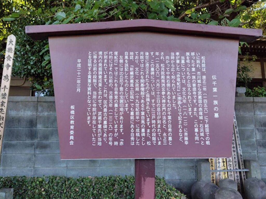 『伝 千葉一族の墓』は下総国ではなく『武蔵千葉氏』と云われる千葉一族の墓で、武蔵千葉氏の祖とされる千葉自胤(ちばよりたね)が1492年に寺領を寄進した松月院に一族の墓がありました。