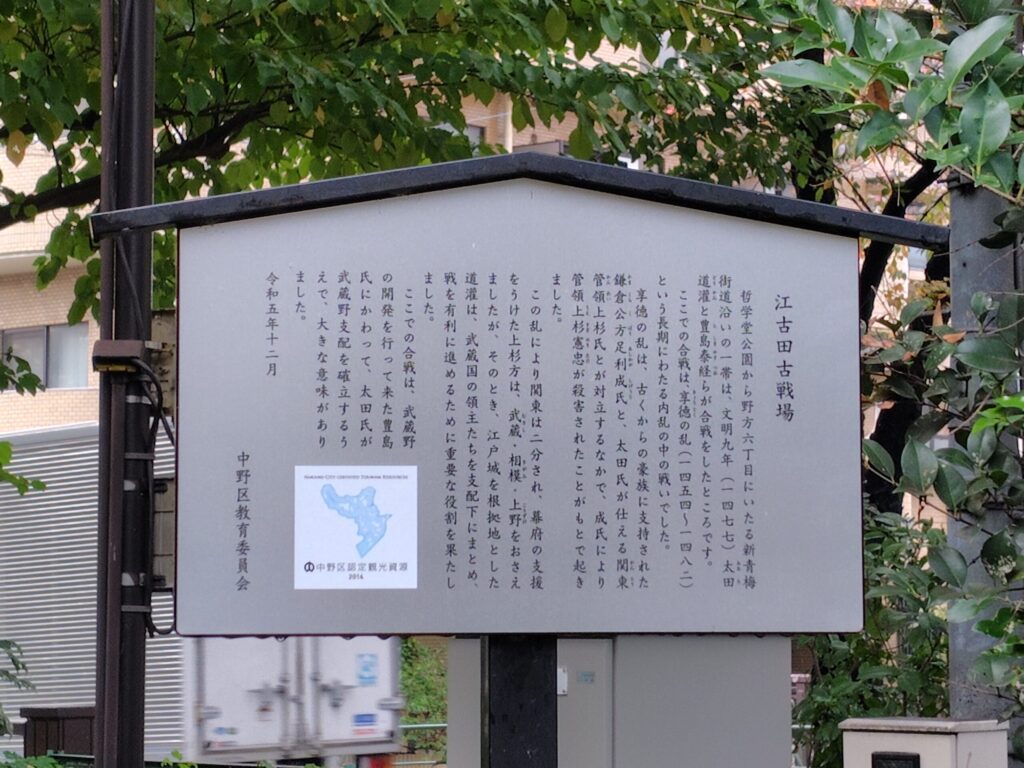 現在の哲学道公園から野方6丁目辺り(新青梅街道沿い一帯)では、太田道灌と豊島泰経らが激戦を繰り返した古戦場(江古田・沼袋の戦い)です!