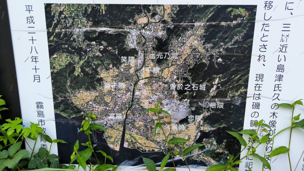 笑隈城(えみのくまじょう)と読みます。読み方は同じで「咲隈城」とも書くようです。別名「隈ノ城(くまのじょう)」とも呼ばれるみたいです。説明版を読むと南北朝期の貞治2年(1363年)頃、第六代当主島津氏久が三年間布陣し、天降川対岸の姫木城(ひめぎじょう)に立て籠もる税所一族だった重久氏と戦ったようです。税所(さいしょ)とは徴税のために任ぜられた役職でこれを世襲していた一族が、税所氏を名乗ったとされるとのことです。
