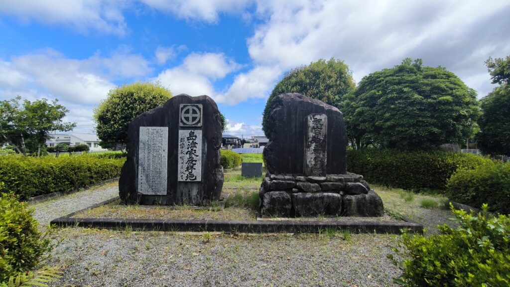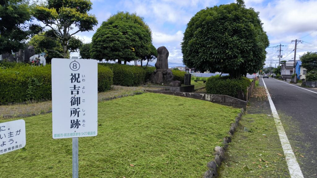 現在の祝吉御所跡(島津氏発祥の地)ですが、住宅街の中に公園のような形で整備されています。遺構などはなく、それほど大きな敷地でもないですが、「島津家発祥地」の石碑などとても目立つので島津氏好きや歴史好きなどであればご訪問をおすすめします!