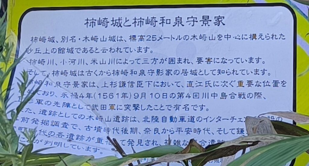 柿崎景家の最後はいくつか説があるようですが、織田方への内通がバレて上杉謙信に討たれた(処刑された)と言われたり、上杉景虎を主君にする謀反を企てたため、処刑されたとする説などがあるようです。柿崎城ですが、謀反を企てた後も家族全員処刑されるなどは行われなかったようで、この場所にその後も柿崎氏の城として残されていたようです。その後、柿崎氏がどうなったかや城がいつ廃城になったかなどはわかっていないようです。