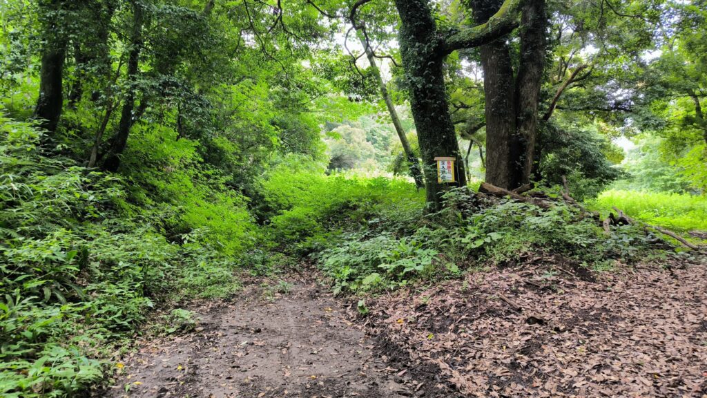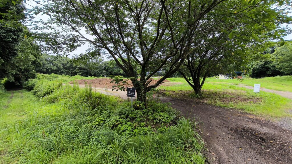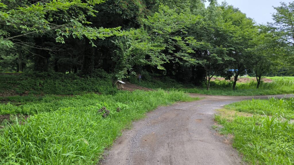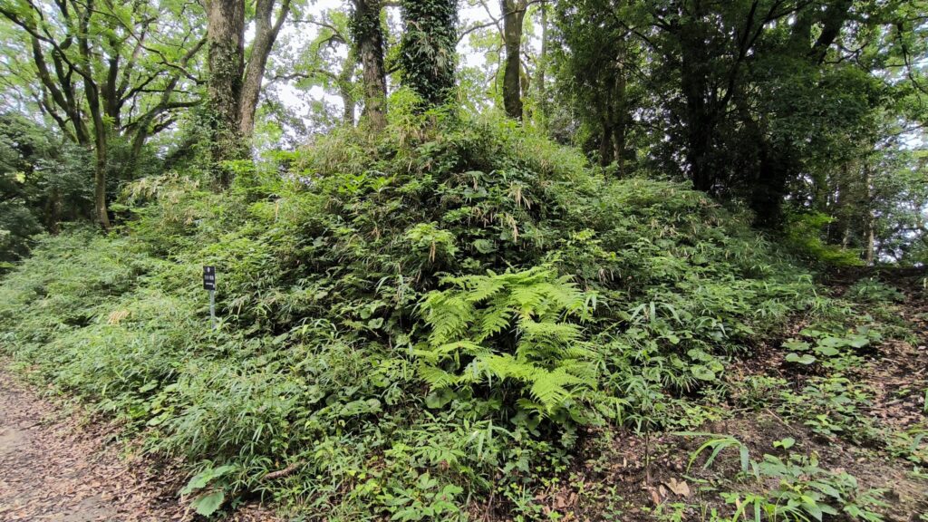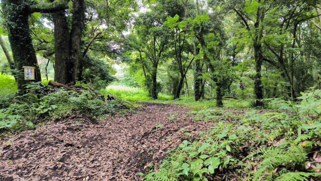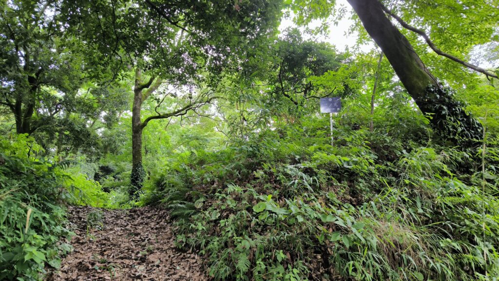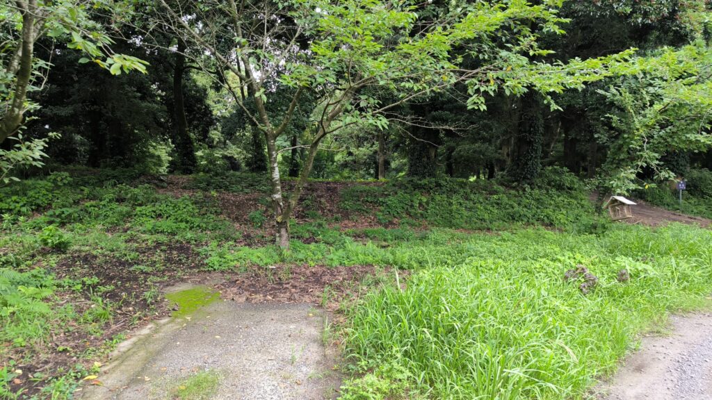 土塁の上に看板は見えるけどどこから上がって良いのか?かなり雨の後で土塁を登るのは滑って泥だらけになる未来しか見えないので断念しました。