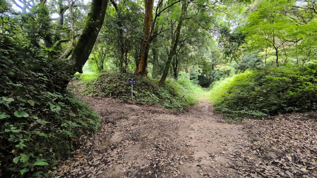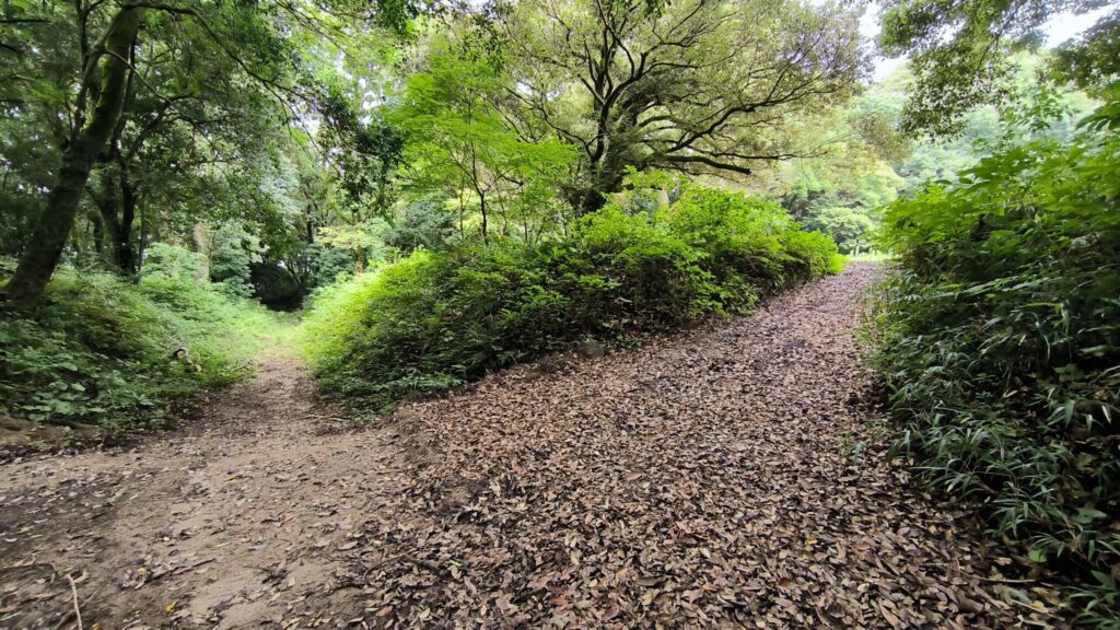 なんか道が分かれてますね。まっすぐはなんか城から降りていく坂道に見えるので搦手とかに行句法だと思われます。