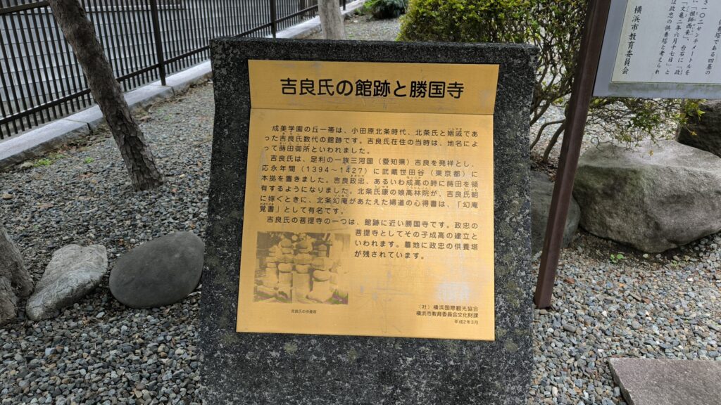 そんな名家の吉良家が横浜にゆかりがあったのがおもしろいなぁと思って今回訪問してきました。蒔田城はこの記事と別に紹介しますが、現在は青山学院横浜英和中学高等学校になっていて遺構もないですが、一般の人は入ることもできない場所になっています。