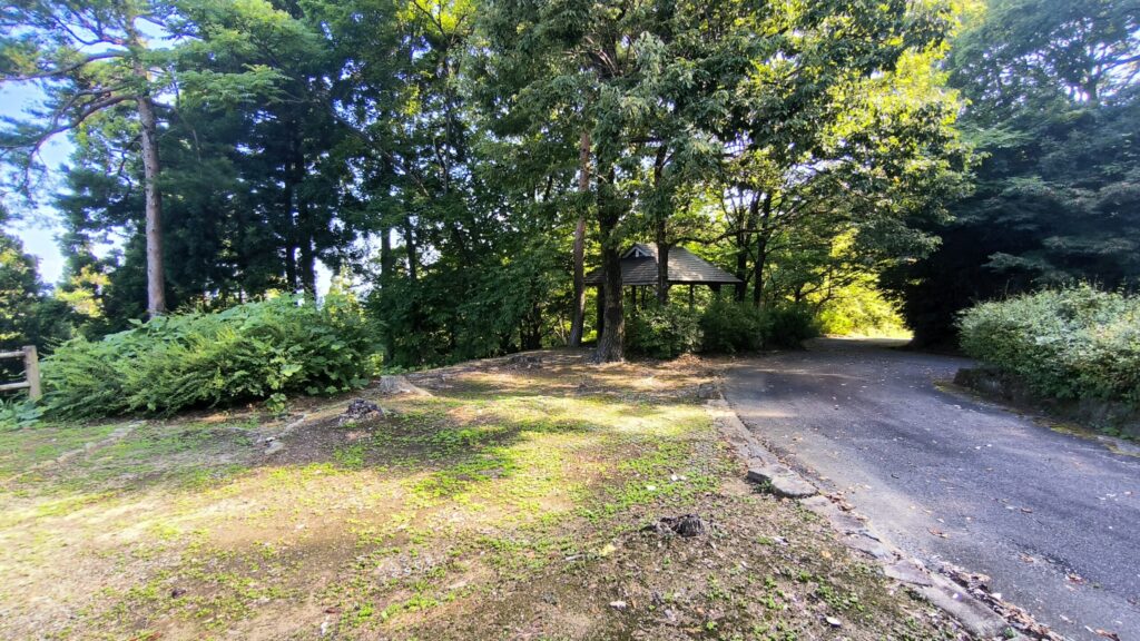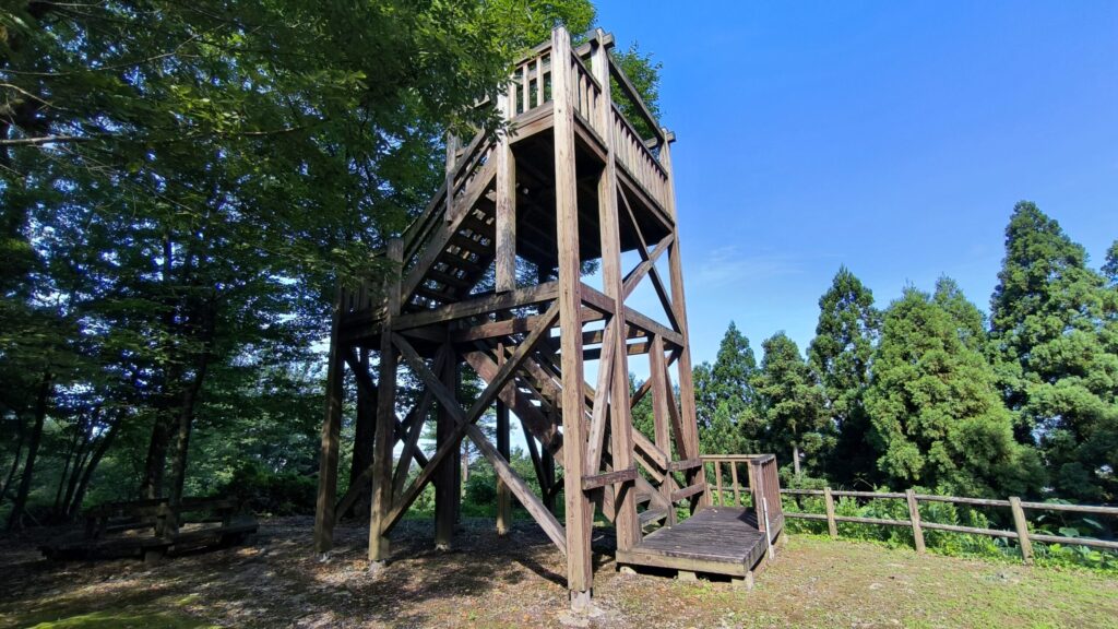 舗装された道を登っていくと升方城跡のモニュメントのような櫓?を発見。
