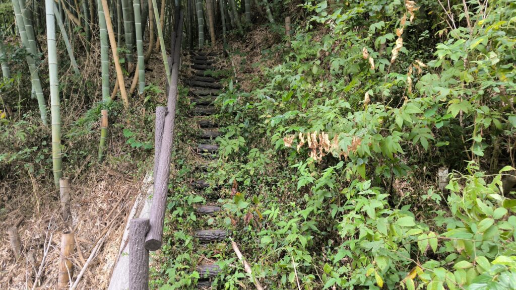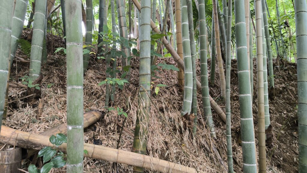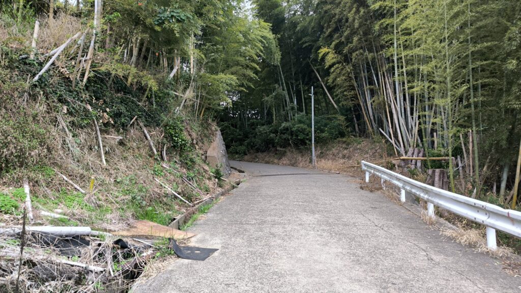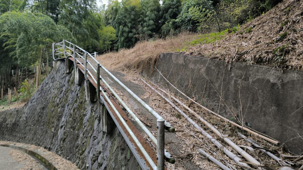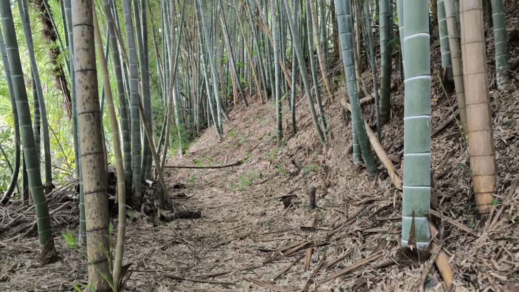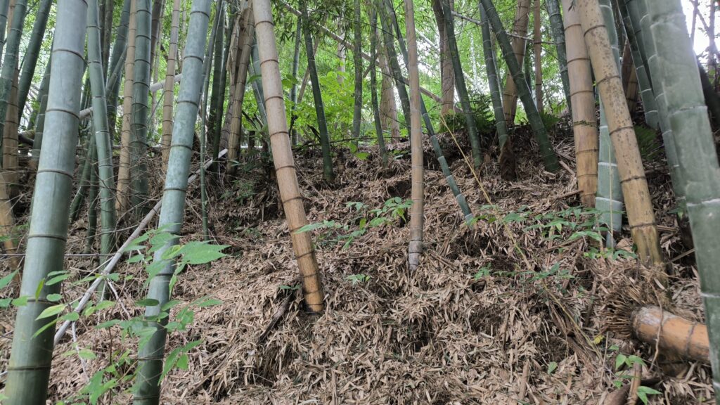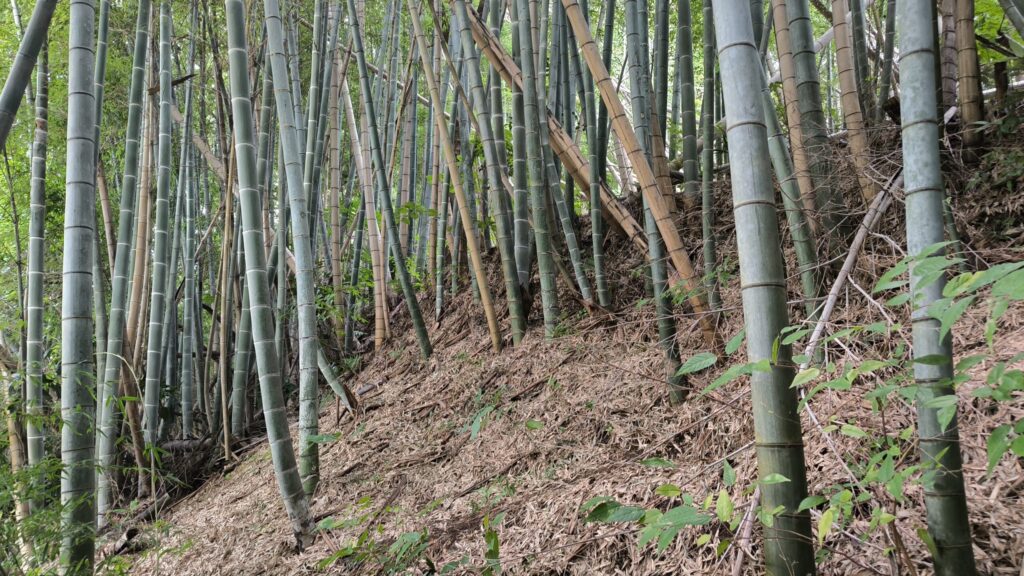 竹林ですね。なんか切岸ぽい感じですが、断定できる感じではないです。奥まで進んでみまみましたが、なんか道も途切れていて案内などもなくここもよく分からなかったです。でも右手上の方が砦跡なはずなので切岸なんじゃないかと感じます。