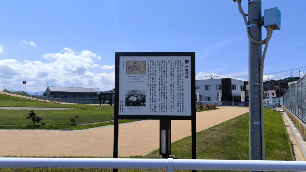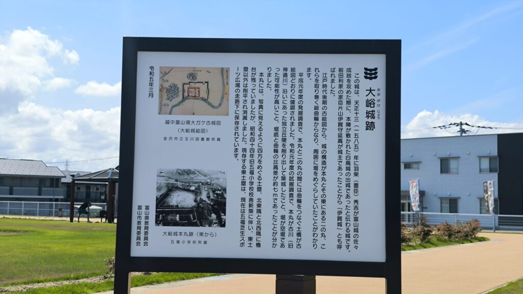 大峪城はおおがけじょうと読みます。現在は「富山市五福芝生スポーツ広場」になっています。その前は五福小学校がここにあったみたいですね。どのように入っていいのか分からず外から撮影させていただきました。