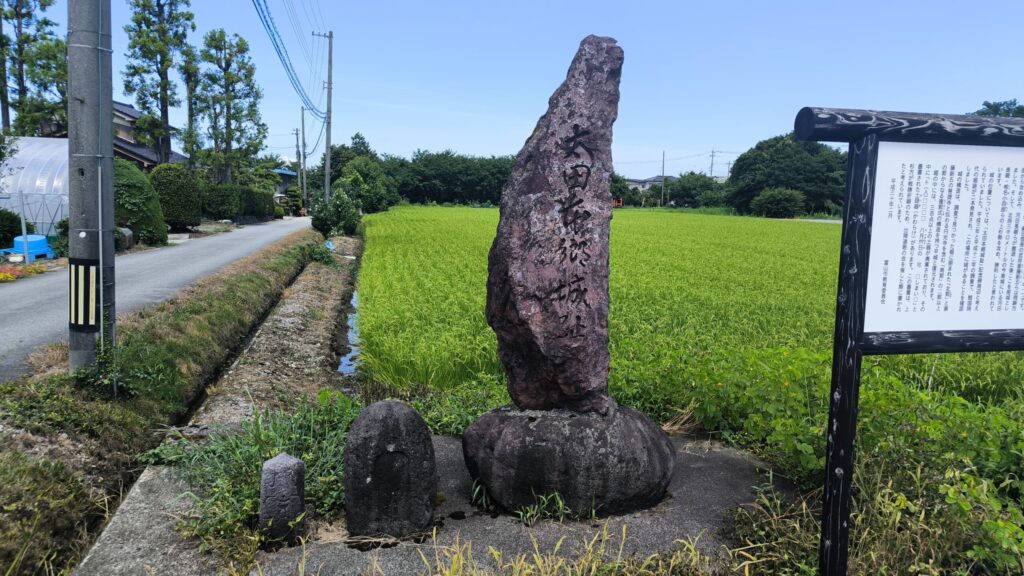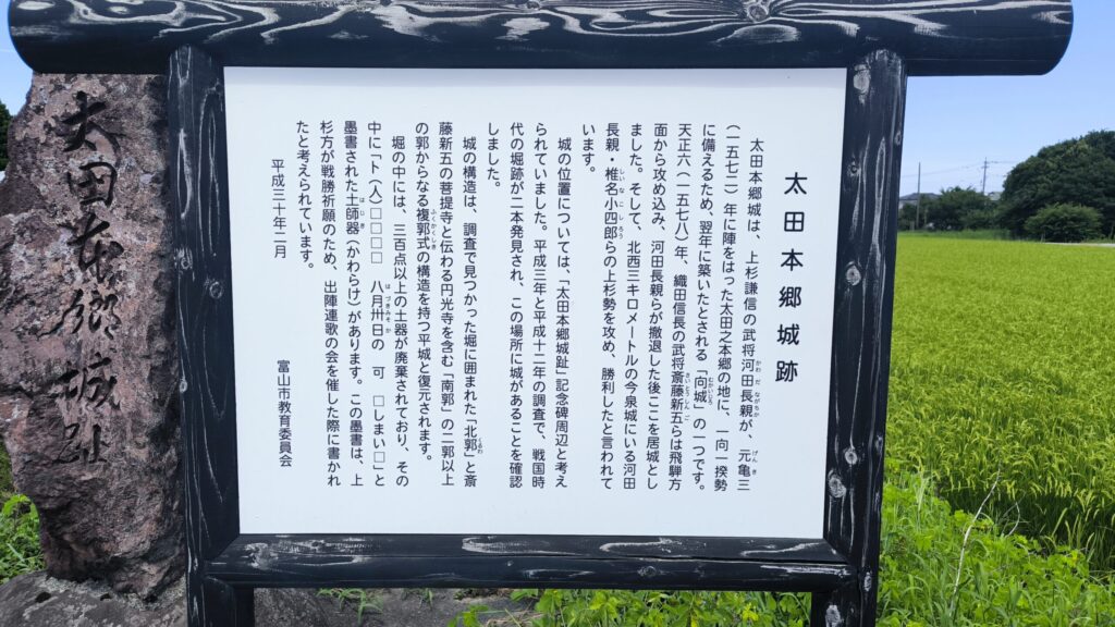 現在の太田本郷城ですがm、遺構らしきものは見ることはできず石碑と説明板が田んぼの脇に建てられていることで城があったんだなと感じることができる程度になります。