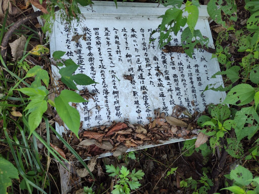1579年に織田軍の細川藤孝・明智光秀軍が侵攻してくると、丹後国守護大名の一色義道は居城の建部山城を支えきれずにこの中山城に退いたとされています。その際に中山城主の沼田幸兵衛が細川氏に内通して逃げ場を失った一色義道が中山城で自刃して果てたと云われ、息子の一色義定は稲富祐直を頼り弓木城https://jh.irukamo.com/yuminokijo/に退き、細川軍に徹底的に抵抗したと云われています。