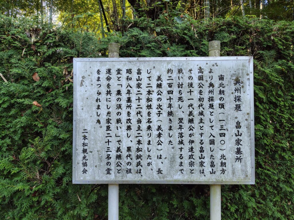 南北朝時代に1340年北朝方より欧州探題として入国した畠山高国が初代とし、十一代目当主畠山義継が伊達政宗と戦い討ち死にするまでの約240年間この地を支配し、畠山義継の次男義孝が畠山氏から二本松氏を名乗ったとされてると案内板には書いてありますが、もっと前から二本松氏と名乗っていたのかもしれませんね!(●^o^●) まぁ~二本松氏よりも畠山氏の方が名が通ているのでごちゃごちゃなのかもしれませんね。