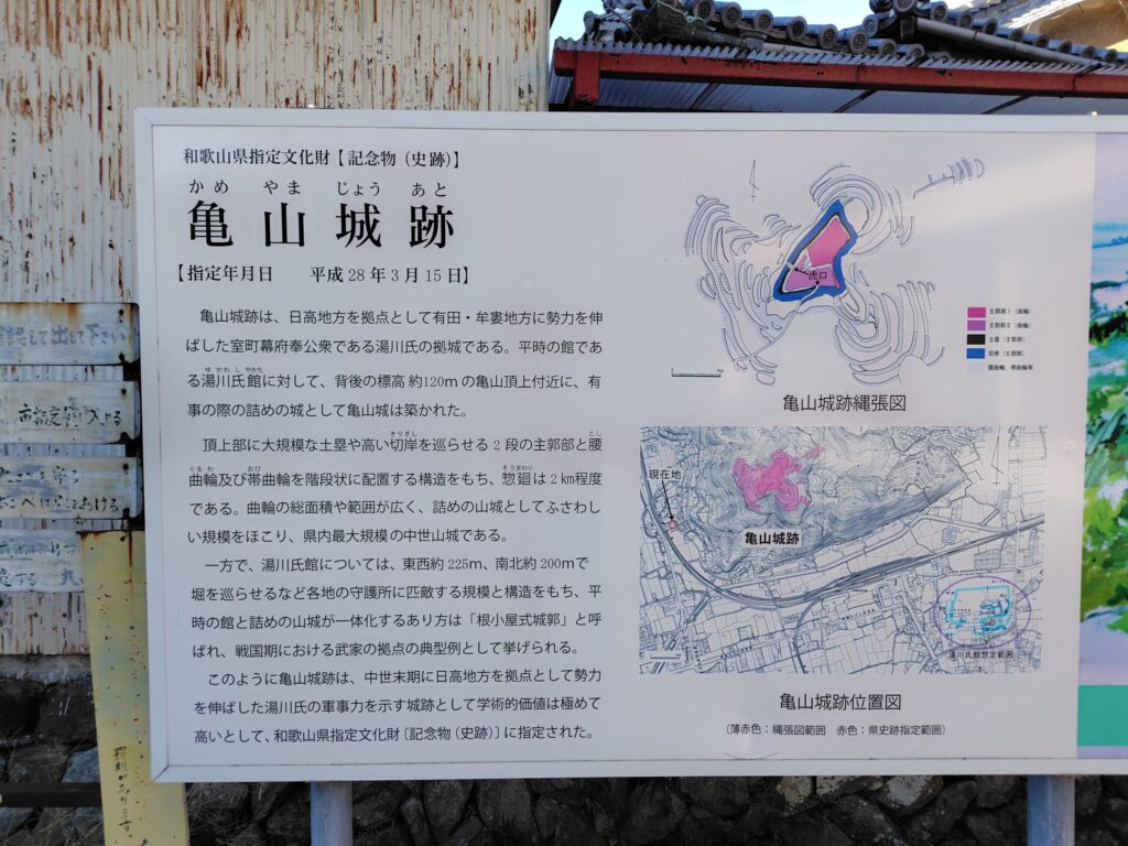亀山城は道湯川(今の和歌山県田辺市)から日高地域(現在の和歌山県御坊市湯川町)へ進出した湯河光春が1348年に築いた城だと云われています。この湯河(湯川)氏がなかなか面白く家紋は『割菱』であることから・・・たぶん、気のまわる方ならわかると思いますが、元々はあの甲斐源氏の武田氏が祖となり、たぶんですが何かしら罪を犯し紀伊(和歌山)国の熊野に配流(まぁ~簡単に言えば島流し的な感じ)された武田(武田三郎忠長という説や武田悪三郎信忠という説があるみたいです♪)氏が土着し湯河氏を名乗り勢力を拡大していったと思われます!!!