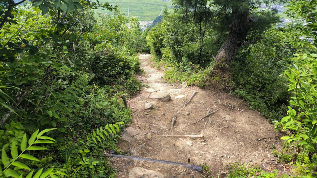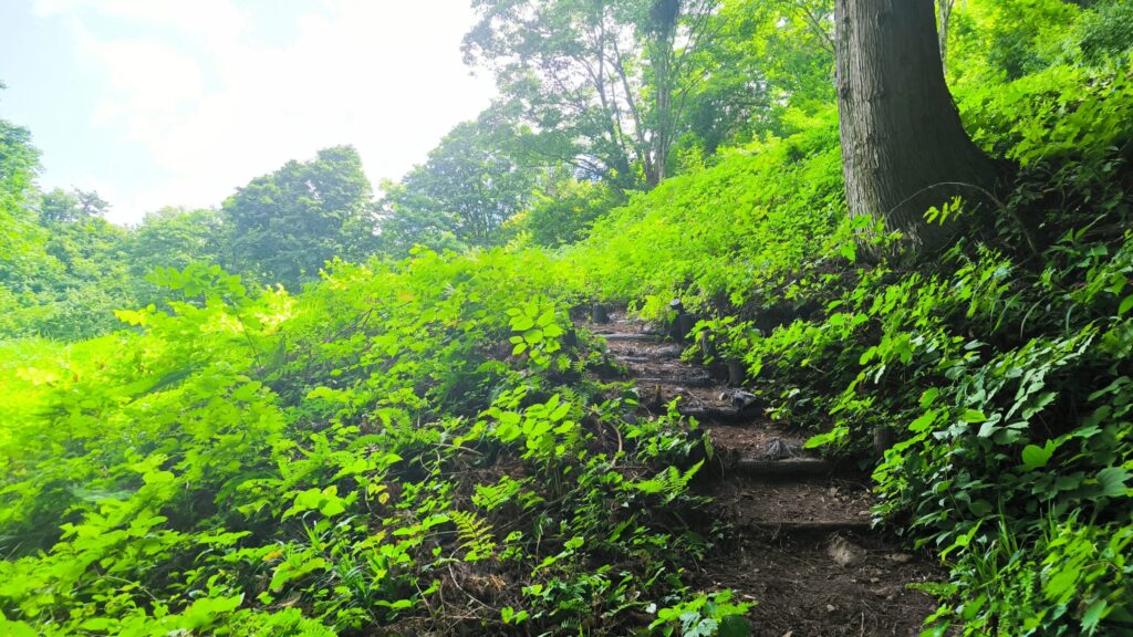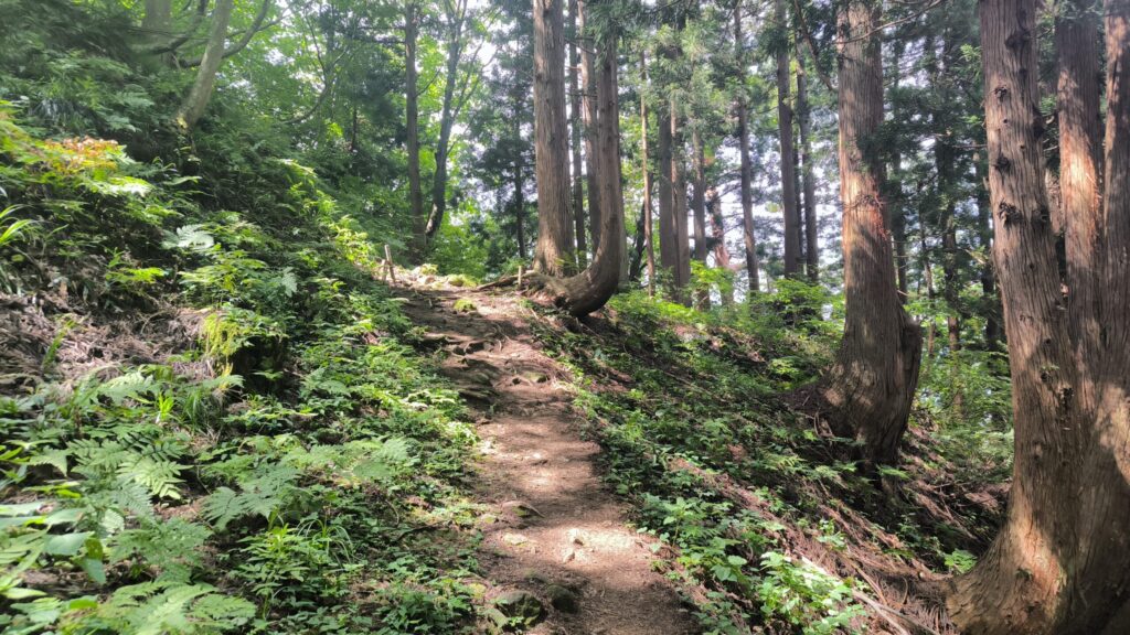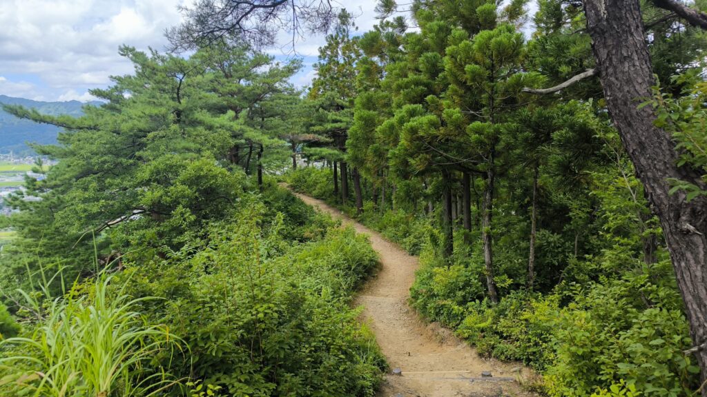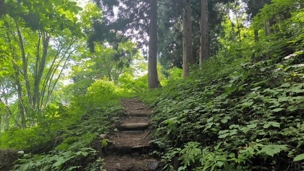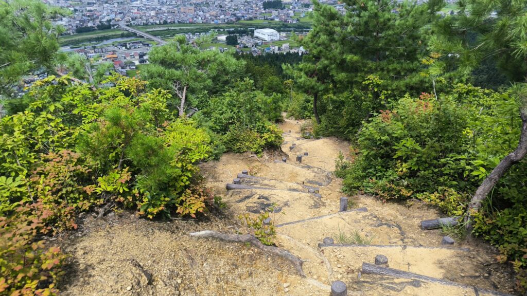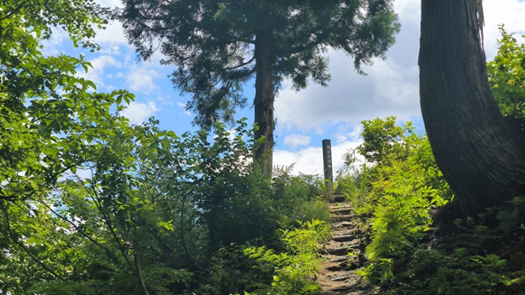 登るルートが2つあるみたいですね。青い方が距離は長くなるけど比較的緩め、赤い方は距離は短くなるけど急な登りが続く道のようです。自分は登りは赤いルート(城坂ルート)で下りは青いルート(薬師尾根ルート)を選びました。