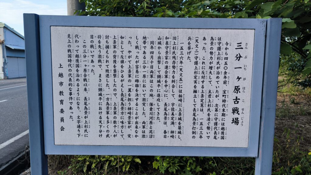 三分一ヶ原古戦場は上杉謙信の父、「長尾為景(ながおためかげ)」を越後守護上杉家の一族柏崎の上条定憲が1530年、1533年、1534年と三度にわたり討伐を図りますが、上手くいかず、1536年4月に府中に進撃してきた琵琶島城城主「宇佐美定満」、柿崎城城主「柿崎和泉守景家」と長尾為景が夷守郷三分一原で激突します。からくも上条方を撃退することができた戦いでした。その合戦のあった場所が三分一ヶ原古戦場と呼ばれています。