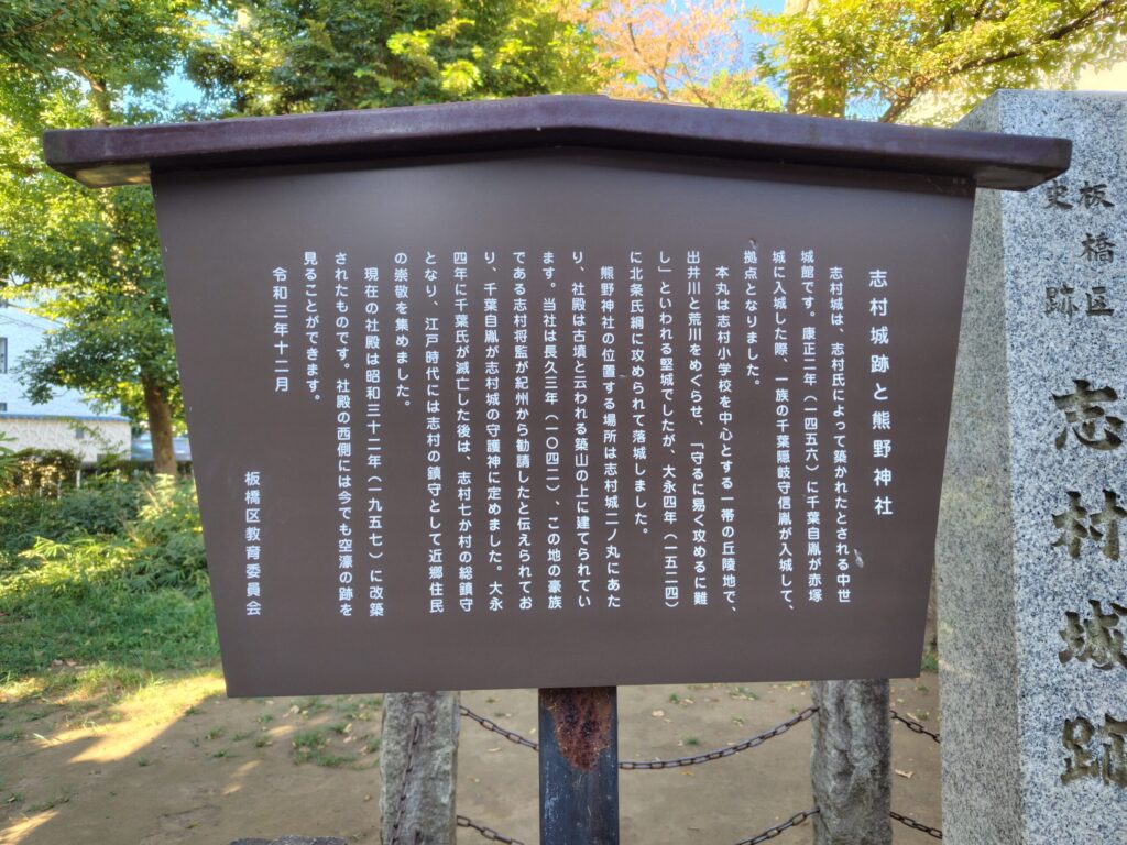 志村城は豊島氏の一族の流れを組む地元の豪族志村氏の城で、武蔵千葉氏に従っていた様で武蔵千葉氏の赤塚城の支城・前線基地として機能していた様です。その時には千葉信胤が入城していたとも云われているようです。