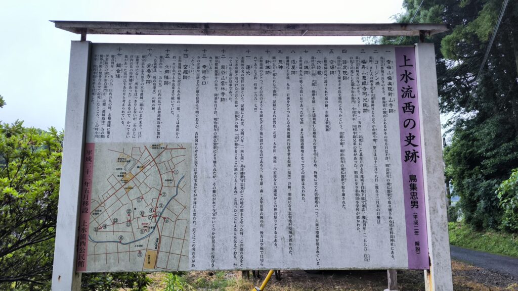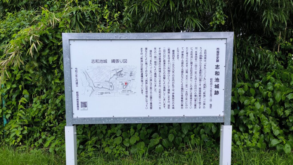 志和池城周辺の史跡案内が麓にありました。ここの看板のある当たりも仮屋跡、その後役場跡になっているので当時の曲輪跡になるのかと思います。