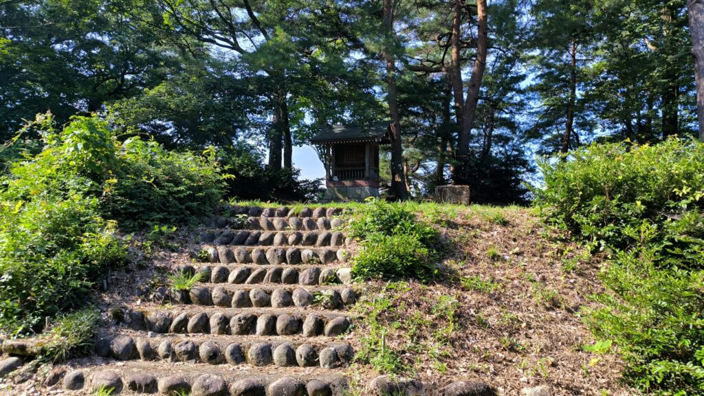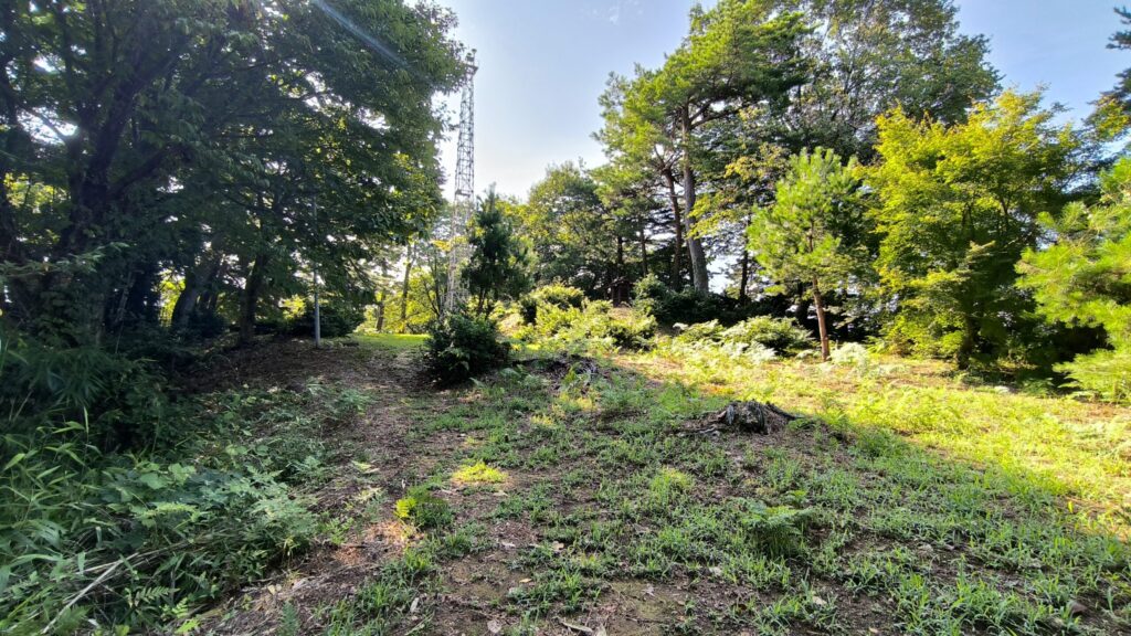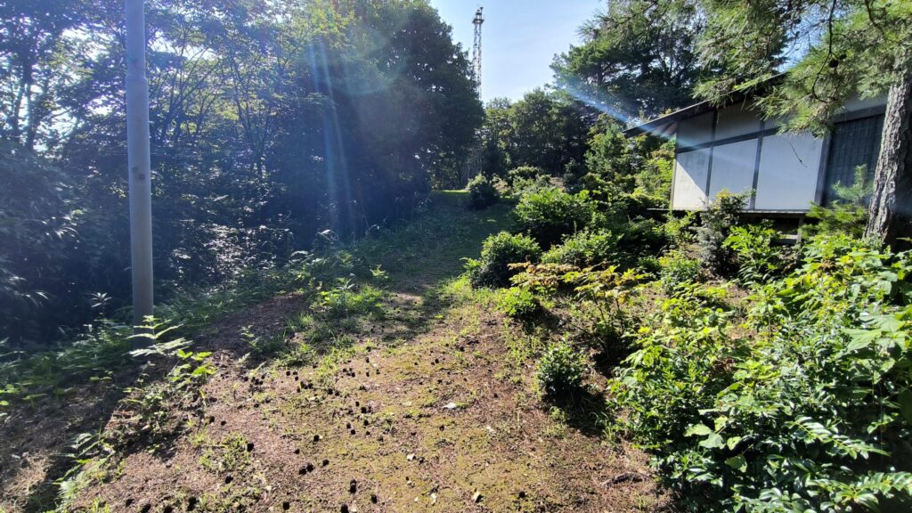 電波塔の方、頂上の曲輪の奥の方へ進んできました。右側の石段が祠のあった一段高くなっているところです。