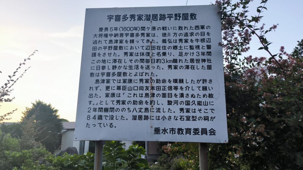 この逃げてきた時に宇喜田秀家が潜居していた場所がこの平野家の屋敷だったということです。ちなみに平野さんは現在もこの場所で生活されている方なので無闇に敷地内に入るなどはしないように気をつけてください。逃げてきて最初にこちらの下屋敷と言われるこの平野屋敷に住まわせてもらい。今回は日没間際で訪問できておりませんが、ここから国道220号線を渡って山側の方に行くと平野屋敷の上屋敷があったところで、その後、そこを宇喜田秀家の屋敷として平野さんが提供してくれたことで約2年半の間、宇喜田秀家は上屋敷で生活することになります。